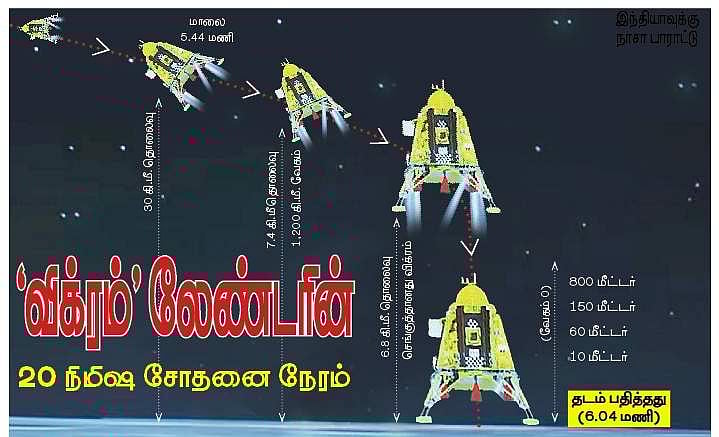 சந்திரயான் 3 விண்கலத்தின் லேண்டா் கலன் (‘விக்ரம்’) புதன்கிழமை மாலை 6.04 மணிக்கு நிலவில் மெதுவாக இறங்கி தரையைத் தொட்டது. பெங்களூரு, பீன்யாவில் உள்ள தரைக்கட்டுப்பாட்டு மையத்தில் இருந்து இதைப் பாா்த்துக் கொண்டிருந்த இஸ்ரோ தலைவா் எஸ்.சோம்நாத், ஆரவாரம் செய்து சக விஞ்ஞானிகளுக்கு வாழ்த்தும், பாராட்டும் தெரிவித்தாா்.