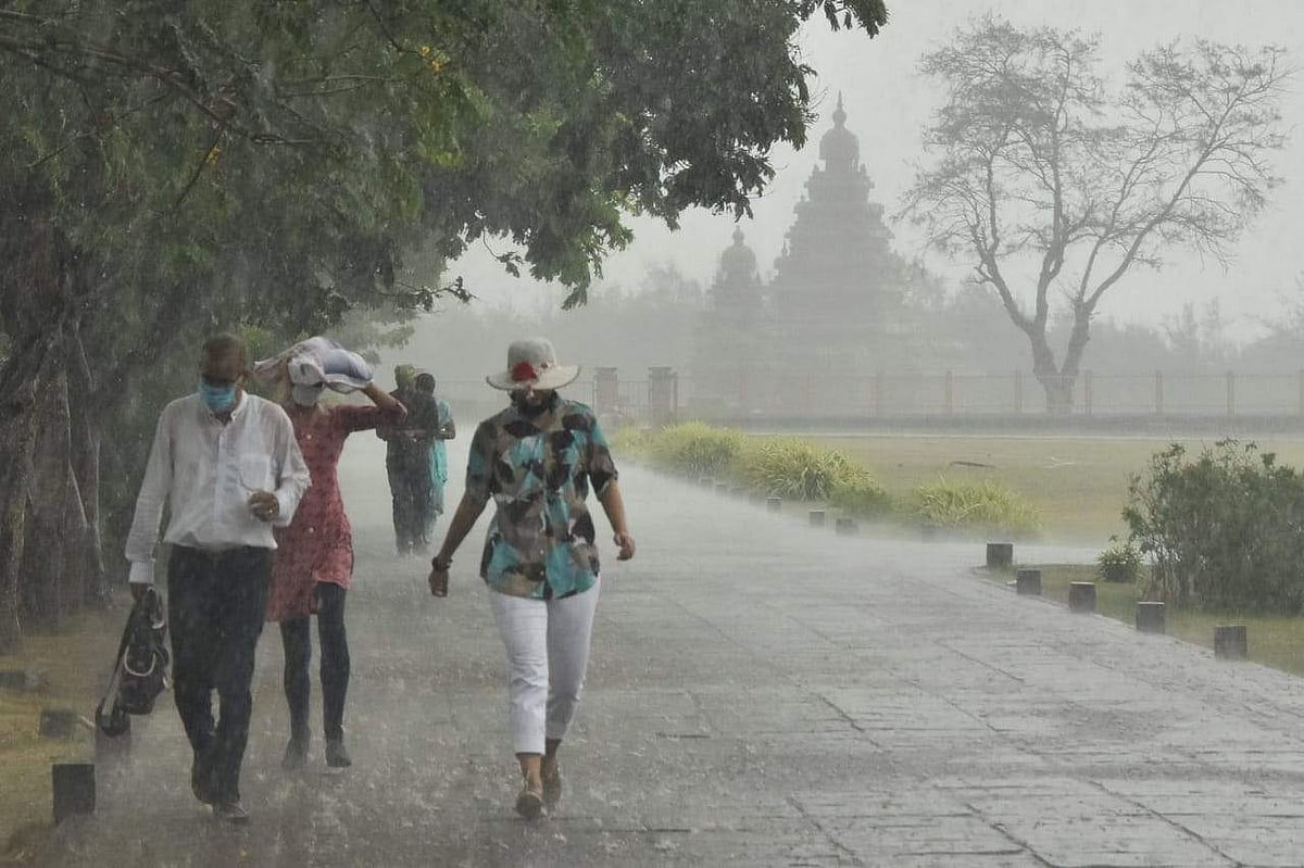 மாமல்லபுரத்தில் தொடர்ந்து பெய்யும் பருவமழையும் பொருட்படுத்தாமல் சுற்றுலாப் பயணிகள் சுற்றுலா இடங்களிலும் கடற்கரையிலும் ஞாயிற்றுக்கிழமை குவிந்தனர்.