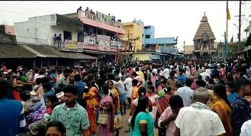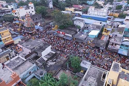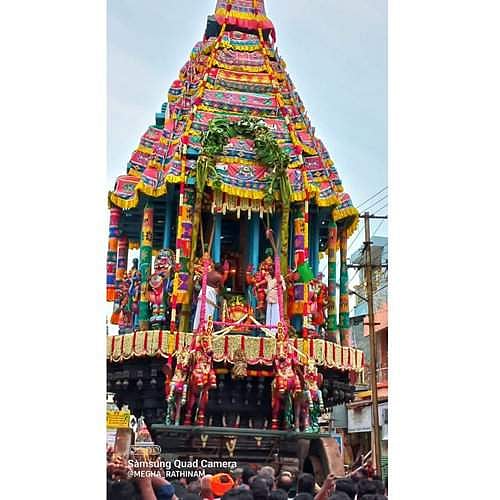 இதையெடுத்து அலங்கரிக்கப்பட்ட விநாயகர் தேர், முருகர் தேர், அம்மன் தேர் , சண்டிகேஸ்வரர் தேர், பெரிய சாமி தேர் ஆகிய ஐந்து தேர்களிலும் சிறப்பு அலங்காரத்தில் சாமிகள் வீற்றிருக்க பக்தர்கள் தேரின் வடம் பிடித்து இழுத்து சாமியை வழிபட்டனர். இவ்விழாவில் 50 ஆயிரத்துக்கும் மேற்பட்ட பக்தர்கள் கலந்துகொண்டு சாமியை தரிசனம் செய்தனர். வழிநெடுகிலும் ஆன்மீக பக்தர்கள் அன்னதானங்கள், குளிர்பானங்கள் , மோர், தண்ணீர் என மாடவீதிகளைச் சுற்றி வழங்கினர்.