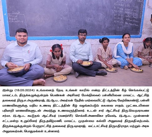 திருக்கழுகுன்றம் பெண்கள் அரசினா் மேல்நிலைப்பள்ளியில் ஆய்வு மேற்கொண்டு, மாணவிகளுக்கு மதிய உணவு திட்டத்தின் கீழ் வழங்கப்படும் கலவை சாதம், முட்டையினை பரிமாறி மாணவிகளுடன் உணவருந்தினாா்.