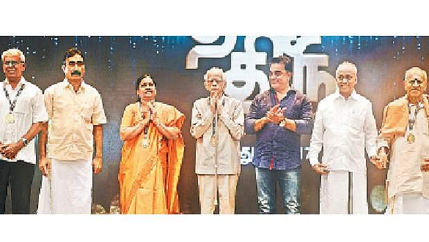 "தி இந்து' தமிழ் நாளிதழின் 4-ஆம் ஆண்டு நிறைவையொட்டி சென்னையில் வெள்ளிக்கிழமை நடைபெற்ற விருது வழங்கும் நிகழ்ச்சியில் (இடமிருந்து) கல்வியாளர் பிரபா கல்விமணி, கி.ரா.பிரபாகர் (கி.ராஜநாராயணனின் மகன்), விஞ்ஞானி என்.வளர்மதி, தினமணி முன்னாள் ஆசிரியர் ஐராவதம் மகாதேவன், நடிகர் கமல்ஹாசன், நீதிபதி வெ.இராமசுப்பிரமணியன், வில்லுப்பாட்டுக் கலைஞர் சுப்பு ஆறுமுகம்.