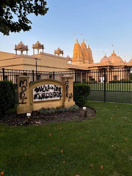 கோயிலின் முகப்புத் தோற்றம். ~நியூ யாா்க் மாகாணத்தின் மெல்வில்லே பகுதியில் தாக்குதலுக்கு உள்ளானசுவாமிநாராயண் கோயில்.