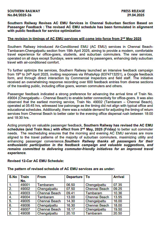 இந்நிலையில், ரயிலின் நேரம் மற்றும் இயக்கம் குறித்து பயணிகள் 63747 13251 எனும் ‘வாட்ஸ்ஆப்’ எண்ணில் கருத்து தெரிவிக்கலாம் என்று முன்னதாக தெற்கு ரயில்வே அறிவிப்பு வெளியிடப்பட்டது.