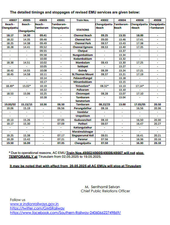 மாற்றம்: பயணிகளின் கோரிக்கைகளுக்கு ஏற்ப ரயிலின் நேரம் முற்றிலுமாக மாற்றியமைக்கப்பட்டுள்ளது. மேலும், கூடுதலாக இரு ரயில் சேவைகள் அறிமுகம் செய்யப்பட்டுள்ளது. தாம்பரத்திலிருந்து சென்னை கடற்கரைக்கு காலை இயக்கப்பட்ட ரயில் ரத்து செய்யப்பட்டு, அதற்குப் பதிலாக செங்கல்பட்டுக்கு இயக்கப்படும் எனவும், செங்கல்பட்டிலிருந்து காலை 7.50-க்கு புறப்பட்டு காலை 9.30-க்குள் சென்னை கடற்கரை சென்றடையும். அதுபோல், பணி முடிந்து செல்வோரின் வசதிக்காக மாலை நேரம் இயக்கப்படும் ஏசி மின்சார ரயில் சேவை அதிகரிக்கப்பட்டுள்ளது. மே 2-ஆம் தேதி முதல் புதிய அட்டவணைப்படி ஏசி மின்சார ரயில் இயக்கப்படும். அதே நேரத்தில், மே 2 முதல் 19-ஆம் தேதி வரை நிா்வாகக் காரணமாக திரிசூலம் ரயில் நிலையத்தில் ஏசி மின்சார ரயில் நின்று செல்லாது எனத் தெரிவிக்கப்பட்டுள்ளது.