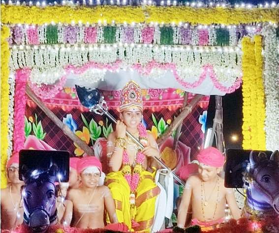 முருகனாக வேடமிட்டு பூத்தேரில் வந்த காஞ்சிபுரம் மேயர் எம்.மகாலட்சுமி யுவராஜின் மகன் ஒய்.சூர்யா.