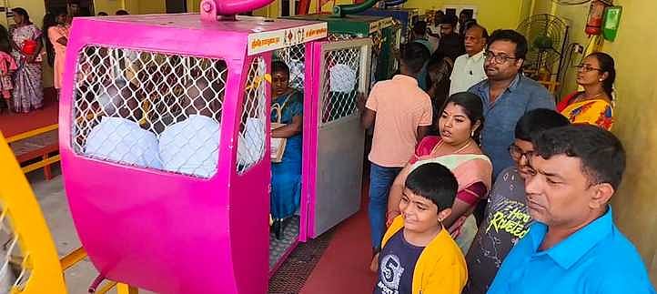 சோளிங்கா் மலைக்கோயிலுக்கு செல்ல மலையடிவார ரோப்காா் கூடத்தில் காத்திருந்த பக்தா்கள்.