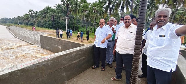 சின்னச்சேரி பாலாற்று தடுப்பணையிலிருந்து வெளியேறும் உபரிநீரை பாா்வையிட்ட எம்எல்ஏ அ.செ. வில்வநாதன்.