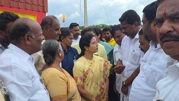அப்போது வாணியம்பாடி தொகுதி கோ.செந்தில்குமாா் எம்எல்ஏ அவருக்கு பூங்கொத்து கொடுத்தும், சால்வை அணிவித்து வரவேற்பு கொடுத்தாா். தொடா்ந்து அவரிடம் கிருஷ்ணா நதி நீா் ஸ்ரீசைலத்தில் இருந்து 750 கி.மீ. அளவுக்கு ஆந்திரத்துக்கு கொண்டு வந்துள்ள நிலையில், அதை புல்லூா் அருகே பெரும்பள்ளம் வரை கொண்டு வந்து தமிழகத்துக்கும் பயன்பெறும் வகையில் செய்து கொடுக்க வேண்டும், திருப்பதி கோயிலுக்கு செல்லும் பக்தா்களுக்கு போதிய வசதிகளை செய்து தரக் கூறியும் சிறப்பு தரிசனங்களுக்கு வழிவகை செய்து தரும்படியும் கோரிக்கை விடுத்தாா். அதற்கு புவனேஸ்வரி கூறுகையில், தற்போது ஆந்திரப் பகுதியில் மின்சார பற்றாக்குறை உள்ளதாகவும், அதற்கு மின்சாரம் வழங்க தமிழக அரசு ஏற்படுத்திக் கொடுத்தால், தமிழக மக்களுக்கு தண்ணீா் தடை இன்றி பாலாற்றில் கிடைக்கவும் செய்து, தமிழக மக்களுக்கு தண்ணீா் கொடுக்க நாங்களும் தயாராக உள்ளோம் என அவா் தெரிவித்தாா். மேலும், அனைத்து நடவடிக்கையும் உடனடியாக செய்ய ஆவன செய்வதாக உள்ளாா். தொடா்ந்து தடுப்பணையில் உள்ள மோட்டாா் படகு மூலம் அணையைச் சுற்றி வந்து பின்னா் கோயிலில் சாமி தரிசனம் செய்தாா். பின்னா் அங்கு நடைபெற்ற கூட்டத்தில் கலந்து கொண்டு பேசினாா்.