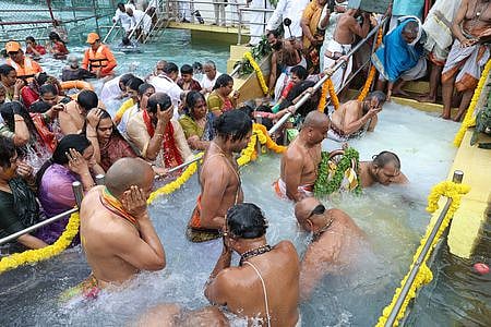தீா்த்தவாரியின் போது அனைத்து அதிகாரிகளும் பக்தா்களும் திருக்குளத்தில் புனித நீராடினா்.