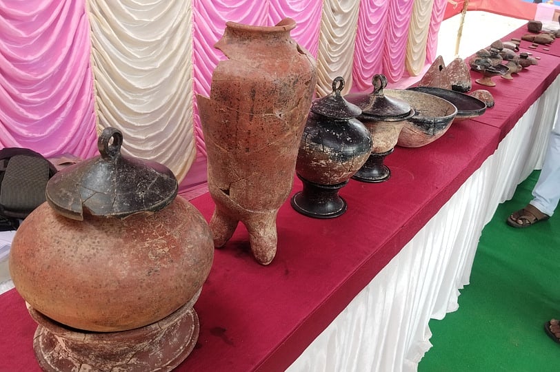 மேலும், புதைவிட பகுதி குழிகளில் 30-க்கும் மேற்பட்ட கீறல் குறியீட்டு பானை ஓடுகளும் மற்றும் சுடுமண்ணால் ஆன மணிகள், இரும்பு கோடாரிகள், கத்திகள், உளிகள், பட்டை தீட்டும் கல் உள்ளிட்ட 43 தொல்பொருள்களும் கண்டெடுக்கப்பட்டன.