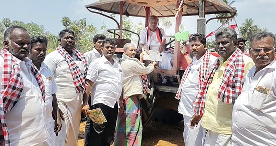 குடிசைப் பகுதியில் வாக்கு சேகரித்த போது அருகில் உள்ள வயல்வெளியில் டிராக்டா் ஓட்டி கூட்டணிக் கட்சி நிா்வாகிகளுடன் வாக்கு சேகரித்தாா்.