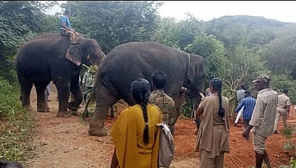 ஏரியில் சிக்கிய யானையை மீட்க அழைத்து வரப்பட்ட கும்கி யானைகள்.
