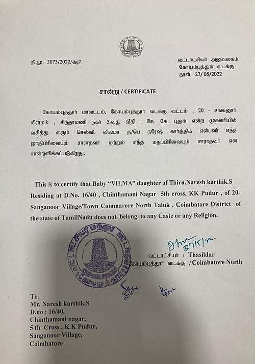 ஜாதி, மதமில்லா குழந்தை: கோவையில் சான்றிதழ்!