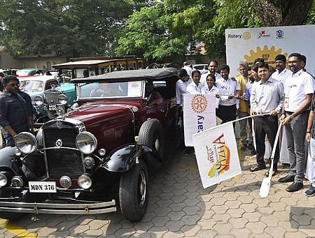 பழமையான காா்களின் அணிவகுப்பைத் தொடங்கிவைக்கிறாா் மாவட்ட ஆட்சியா் கிராந்திகுமாா் பாடி.
