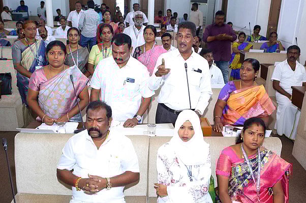 6 சதவீத சொத்துவரி உயா்வை எதிா்த்து மாமன்றக் கூட்டத்தில் மேயருடன் வாக்குவாதத்தில் ஈடுபட்ட வாா்டு உறுப்பினா்கள். ~