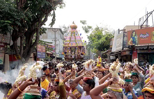 சித்திரை திருவிழாவை முன்னிட்டு கோவையில் வியாழக்கிழமை பக்தா்கள் வெள்ளத்தில் அசைந்து வரும் கோட்டைமேடு சங்கமேசுவரா் கோயில் தோ்.