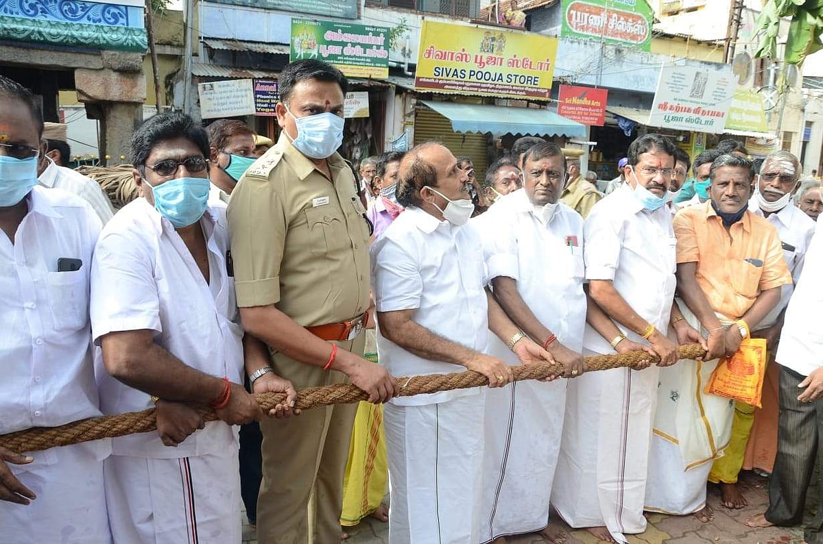 ஈரோடு கோட்டை கஸ்தூரி அரங்கநாதர் கோயில் தேரோட்டத்தை எம்எல்ஏக்கள் வடம் பிடித்து தொடங்கி வைத்தனர்.