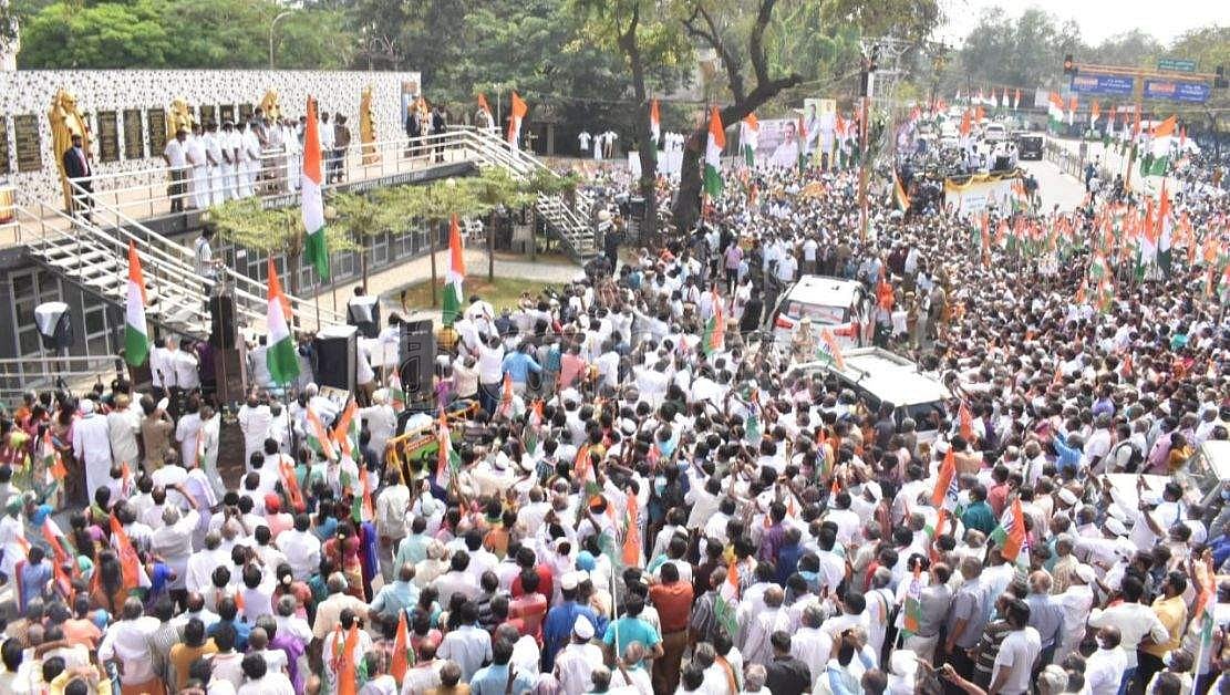 ஈரோடு பன்னீர்செல்வம் பூங்காவில் ராகுல் காந்தி பேச்சை கேட்ட திரண்ட காங்கிரஸ் கட்சியினர்.