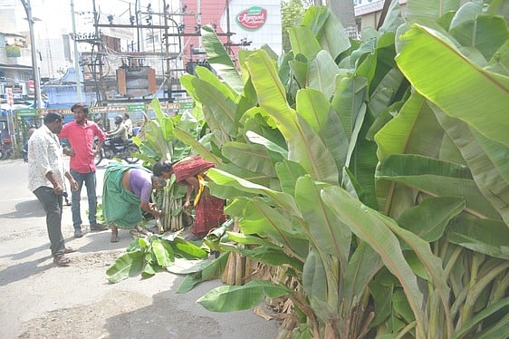 ஈரோடு மணிக்கூண்டு பகுதியில் விற்பனைக்கு வைக்கப்பட்டுள்ள வாழைக் கன்றுகள்.