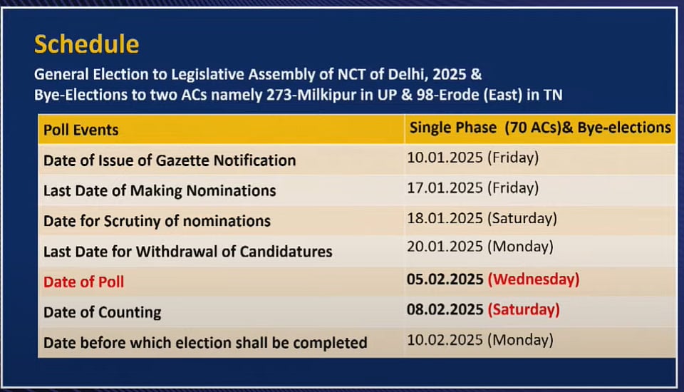 இந்த நிலையில், தில்லி சட்டப்பேரவைத் தேர்தலுடன் மாநிலங்களின் சட்டப்பேரவைகளுக்கான இடைத்தேர்தல் தேதியையும் இந்திய தேர்தல் ஆணையர் ராஜீவ் குமார் செவ்வாய்க்கிழமை வெளியிட்டுள்ளார்.