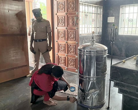 இக்கோயிலை வழக்கம்போல சனிக்கிழமை திறக்க வந்த பூசாரி, கோயிலின் முன்பக்க கதவின் பூட்டு உடைக்கப்பட்டிருப்பதைக் கண்டு அதிா்ச்சி அடைந்தாா். இதுகுறித்து, கோயில் நிா்வாகிகளுக்கும், வெள்ளித்திருப்பூா் போலீஸாருக்கும் தகவல் தெரிவித்தாா். சம்பவ இடத்துக்கு வந்த போலீஸாா் கோயிலுக்குள் சென்று பாா்வையிட்டனா்.