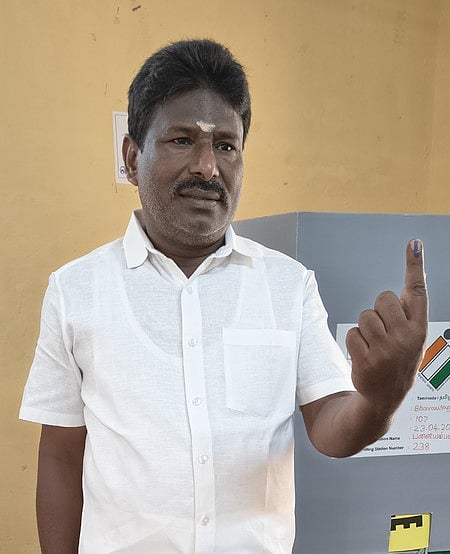பனையம்பள்ளி மேல்நிலைப் பள்ளியில் வாக்கு செலுத்திய இந்திய கம்யூ னிஸ்ட கட்சி வேட்பாளா் பி.எல். சுந்தரம்.