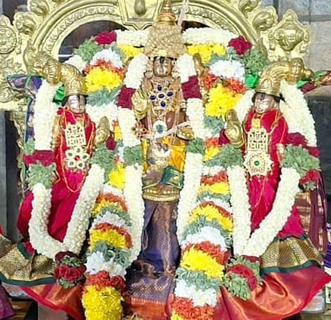 மணக்கோலத்தில் அருள்பாலிக்கும்  ஸ்ரீதேவி, பூதேவி உடனமா் ஆதிகேசவப் பெருமாள்.