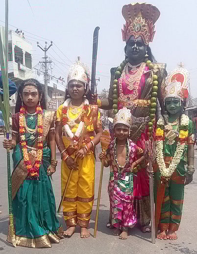 காய்கறிகளை  ஆடையாக  உடுத்திச்  சென்ற  பக்தா்கள்.  ~தெய்வங்களின்  வேடமணிந்து  வந்த பக்தா்கள்.