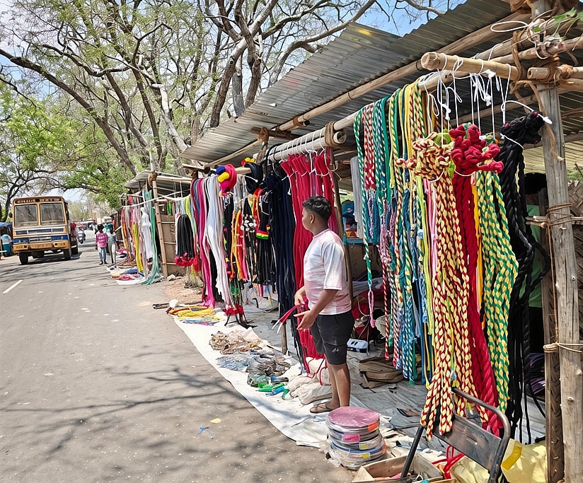 சந்தையையொட்டி வைக்கப்பட்டிருந்த சாட்டை, கயிறு கடைகள்.