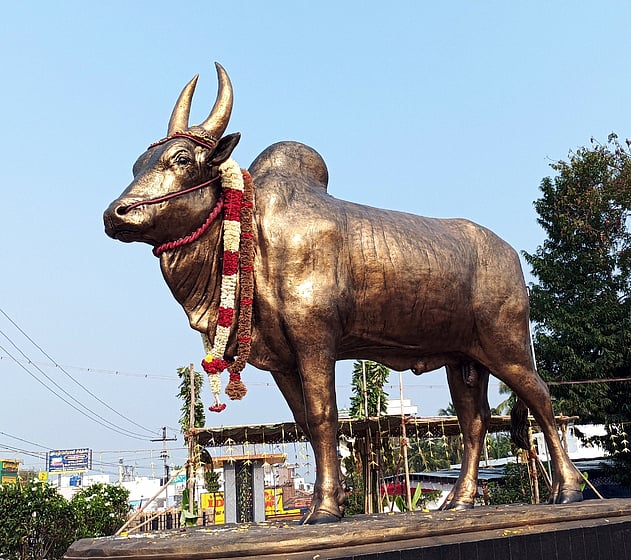 காங்கயத்தில் அமைக்கப்பட்டுள்ள காங்கேயம் காளை மாடு சிலை.