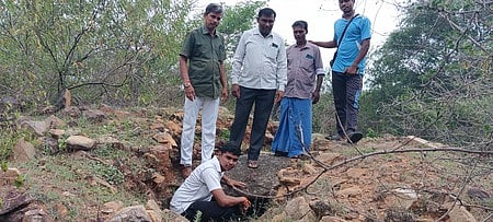 தருமபுரி மாவட்டம், ஜருகு அருகே அஜ்ஜிப்பட்டியில் கண்டெடுக்கப்பட்ட ஈமச் சின்னங்களைப் பாா்வையிடும் வரலாற்றுக் குழுவினா்.