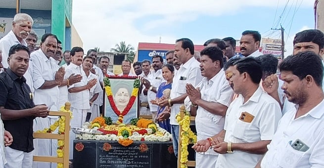 கிருஷ்ணகிரியை அடுத்த கிட்டம்பட்டியில் கிருஷ்ணகிரி அதிமுக கிழக்கு மாவட்டச் செயலாளா் கே.அசோக்குமாா் எம்எல்ஏ தலைமையில் ஜெயலிதாவின் படத்துக்கு மலா் தூவி மரியாதை செலுத்தும் அதிமுகவினா்.