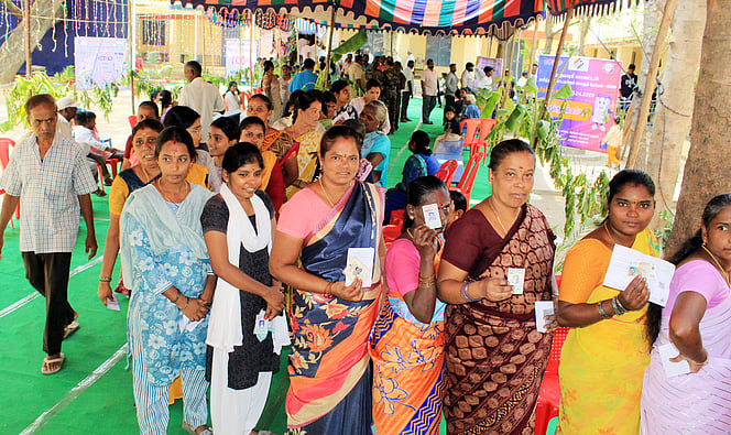 தருமபுரி அன்னசாகரம் அரசுப் பள்ளியில் உள்ள வாக்குச்சாவடியில் வாக்களிக்க நீண்ட வரிசையில் காத்திருந்த பெண்கள்.