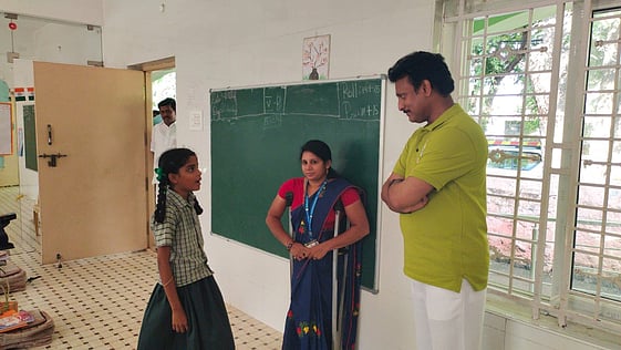 ஊத்தங்கரை அரசு தொடக்கப் பள்ளியில் ஆய்வு மேற்கொள்ளும் அமைச்சா் அன்பில் மகேஸ் பொய்யாமொழி.