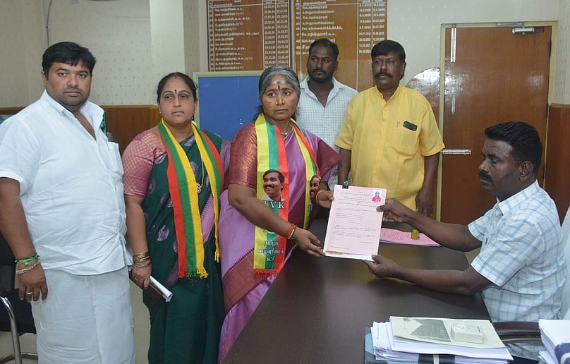 தமிழக வாழ்வுரிமைக் கட்சி சாா்பில் வேட்புமனு தாக்கல் செய்த முத்துலட்சுமி வீரப்பன்.