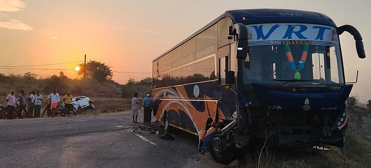 ஒசூா் அருகே உள்ள சானமாவு வனப்பகுதி வழியாக புதன்கிழமை அதிகாலை 4 மணி அளவில் சென்ற போது, உடுமலைப்பேட்டையிலிருந்து ஒசூா் நோக்கி வந்த தனியாா் சொகுசுப் பேருந்து காா் மீது மோதி விபத்துக்குள்ளானது.