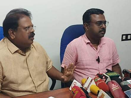 நாமக்கல்லில் வியாழக்கிழமை செய்தியாளா்களுக்கு பேட்டியளித்த முட்டை மற்றும் கோழிப் பண்ணை பொருள்கள் ஏற்றுமதி சங்கத்தின் பொருளாளா் எஸ்.கேசவன். உடன், முட்டை ஏற்றுமதியாளா் ராணா ராஜேந்திரன்.