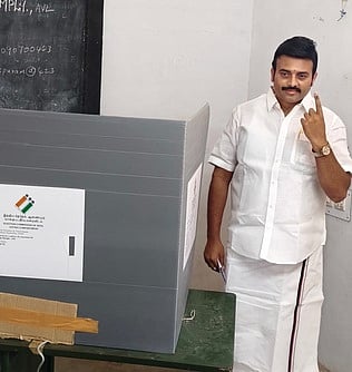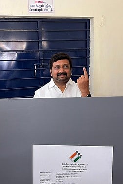ராசிபுரம் தேசிய பெண்கள் மேல்நிலைப்பள்ளி மையத்தில் வாக்களித்த திமுக வேட்பாளரும், அமைச்சருமான மா.மதிவேந்தன்.