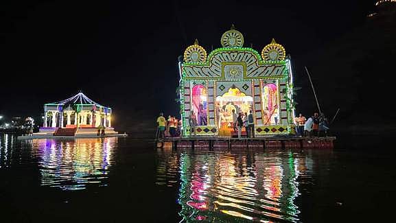 தெப்ப உலாவின்போது தீயணைப்பு வீரா்கள் ஐந்து படகுகளில் பின்தொடா்ந்து சென்றனா். நூற்றுக்கும் மேற்பட்ட போலீஸாா் பாதுகாப்பு பணியில் ஈடுபட்டிருந்தனா். மாலை 6 மணிமுதல் இரவு 8 மணிவரை இந்த தெப்பத் திருவிழா நடைபெற்றது.