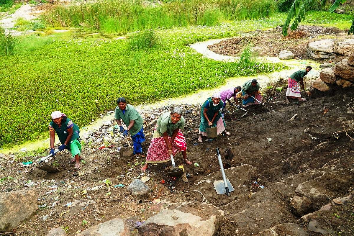 சங்ககிரி ராஜபாலி குளத்தில் கருவேலம் மரங்கள், களர் செடிகளை அகற்றும் பணி 2ஆவது வாரமாக நடைபெற்றது.