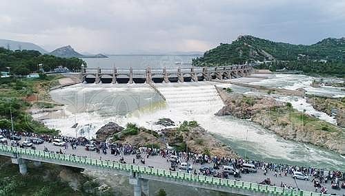 கழுகு பார்வையில் மேட்டூர் அணையில் இருந்து வெளியேறும் உபரி நீரை மேம்பாலத்தில் இருந்தபடி பொதுமக்கள் கண்டுகளித்தனர்