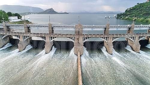 மேட்டூர் அணை கழுகு பார்வையில் முழு கொள்ளளவான 120 அடி எட்டியதை தொடர்ந்து மேட்டூர் அணையிலிருந்து உபரி நீர் வெளியேற்றப்பட்டு வருகிறது.