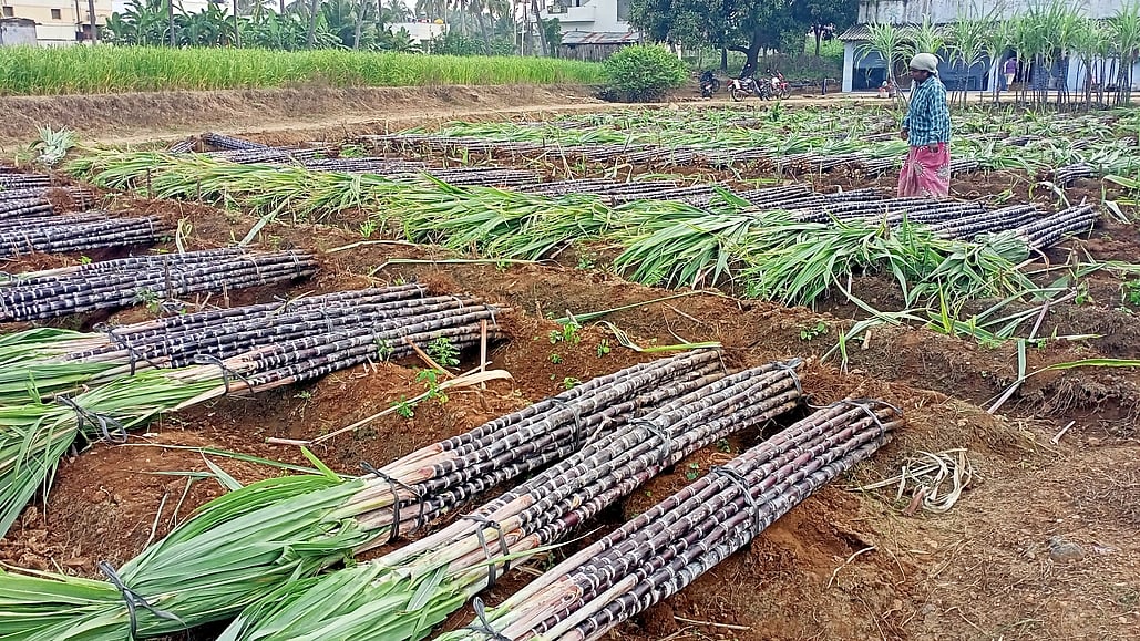 அந்தப் பகுதியில் அறுவடை செய்யப்படும் கரும்புகள்.