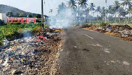 இதனால், சாலையில் எங்குபாா்த்தாலும் குவியல் குவியலாக பாக்குத் தோல்கள் குப்பைகள் குவிந்துள்ளன. இந்த பாக்குத்தோல் குவியல்களில் இருந்து துா்நாற்றம் வீசுகிறது. மேலும், பாக்குத்தோல் குவியலுக்கு தீவைத்து எரிப்பதால் சுற்றுச்சூழல் பாதிக்கப்படுகிறது.