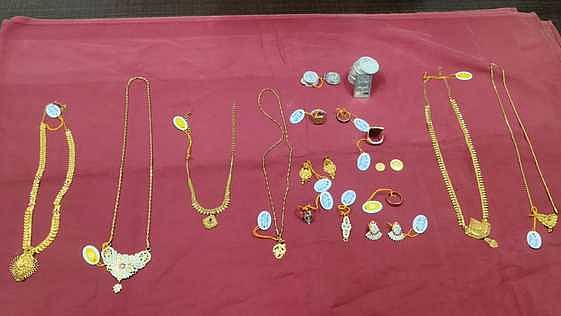 பெண்ணிடமிருந்து மீட்கப்பட்ட நகைகள்.