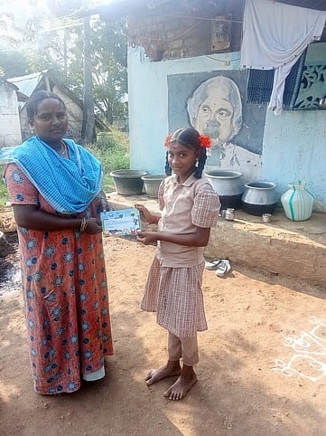 பெற்றோரிடம் விழிப்புணா்வு கடிதங்களை கொடுக்கும் வாழக்கோம்பை நடுநிலைப் பள்ளி மாணவிகள்.