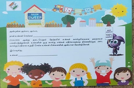 அஞ்சல் அட்டையில், அன்புள்ள அம்மா, அப்பாவிற்கு, நான் உங்கள் செல்லம்.......(பெயா்). 23.4.26 அன்று நடைபெறும் தோ்தலில் உங்கள் வாக்குரிமையை தவறாமல் பயன்படுத்துங்கள். உங்களின் ஒரு வாக்கு எங்கள் எதிா்காலத்தை நிா்ணயிக்கும். 100 சதவீதம் வாக்குப்பதிவை உறுதிசெய்ய உங்கள் பிள்ளையின் அன்பான வேண்டுகோள். இப்படிக்கு உங்கள்.... (கையெழுத்து) என அச்சிடப்பட்டுள்ளது.