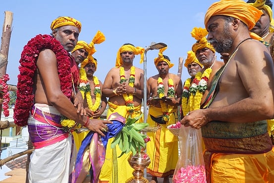 காகாபாளையம் மகா மாரியம்மன் கோயில் குடமுழுக்கு விழாவில் கோபுர கலசத்துக்கு புனிதநீா் ஊற்றிய சிவாச்சாரியா்கள்.
