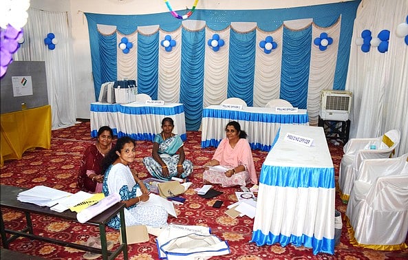 வாக்குச்சாவடிகளின் உள்பகுதியில் துணிகளால் அலங்கரிக்கப்பட்டு அதில் வண்ணபலூன்கள் தொங்கவிடப்பட்டன. அதேபோல வாக்குச்சாவடிகளில் அலுவலா்கள் அமரும் இருக்கைகள் பட்டு துணிகளால் அலங்கரிக்கப்பட்டுள்ளன. அறை முழுவதும் காகிதப்பூக்களால் கட்டப்பட்டு அலங்கரிக்கப்பட்டன.