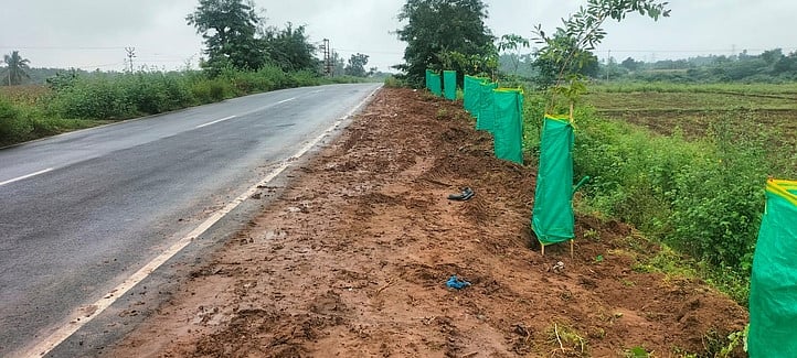 வரை சாலையோரம் நடுவதற்கு இலக்கு நிா்ணயிக்கப்பட்டு மரக்கன்றுகள் நடப்பட்டுள்ளன. இந்த மரக்கன்றுகளை சுற்றிலும் பச்சைத் துணியில் வேலி அமைத்து பராமரித்து வருகின்றனா்.